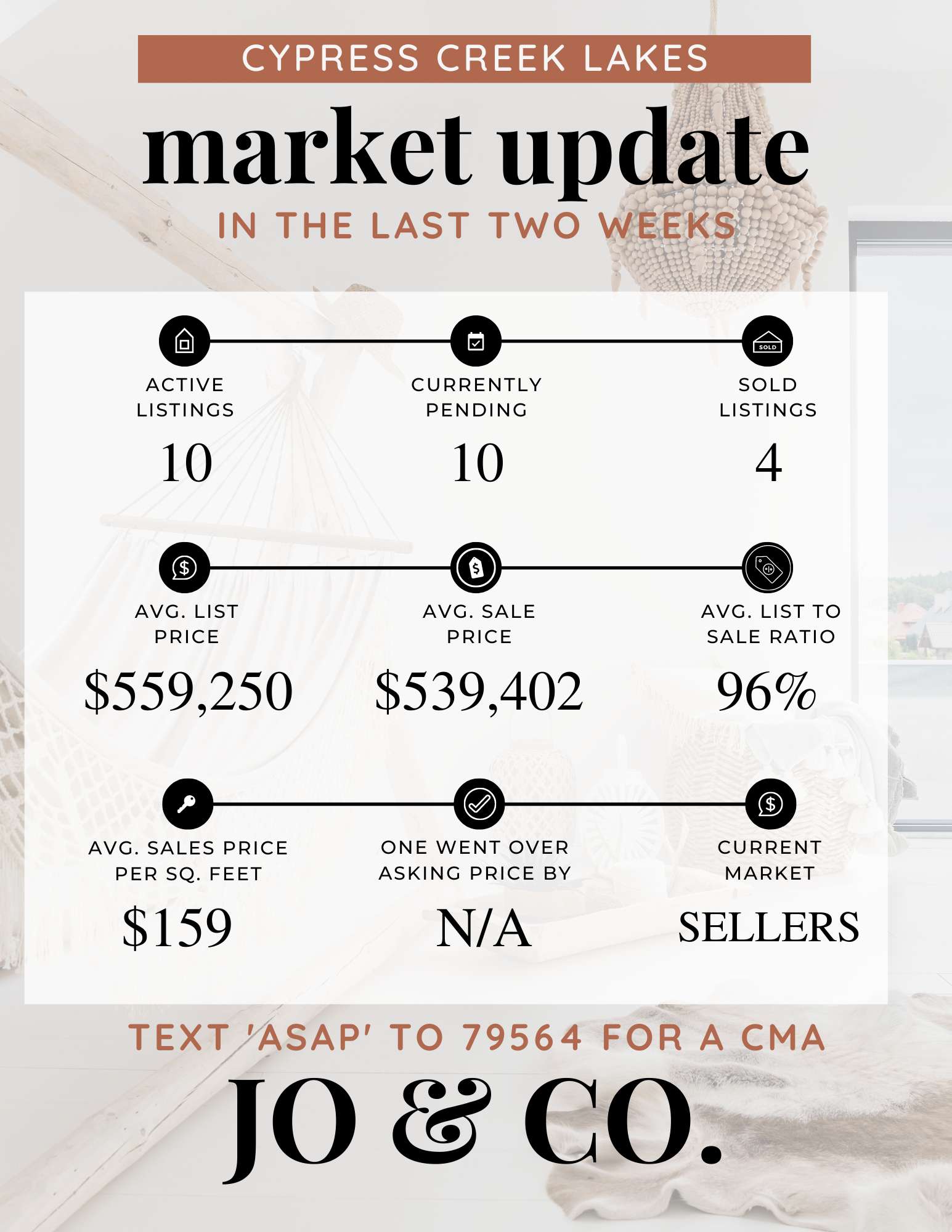 Check out the graphic below for a larger overview of the real estate market for the last two weeks in Cypress Creek Lakes.
