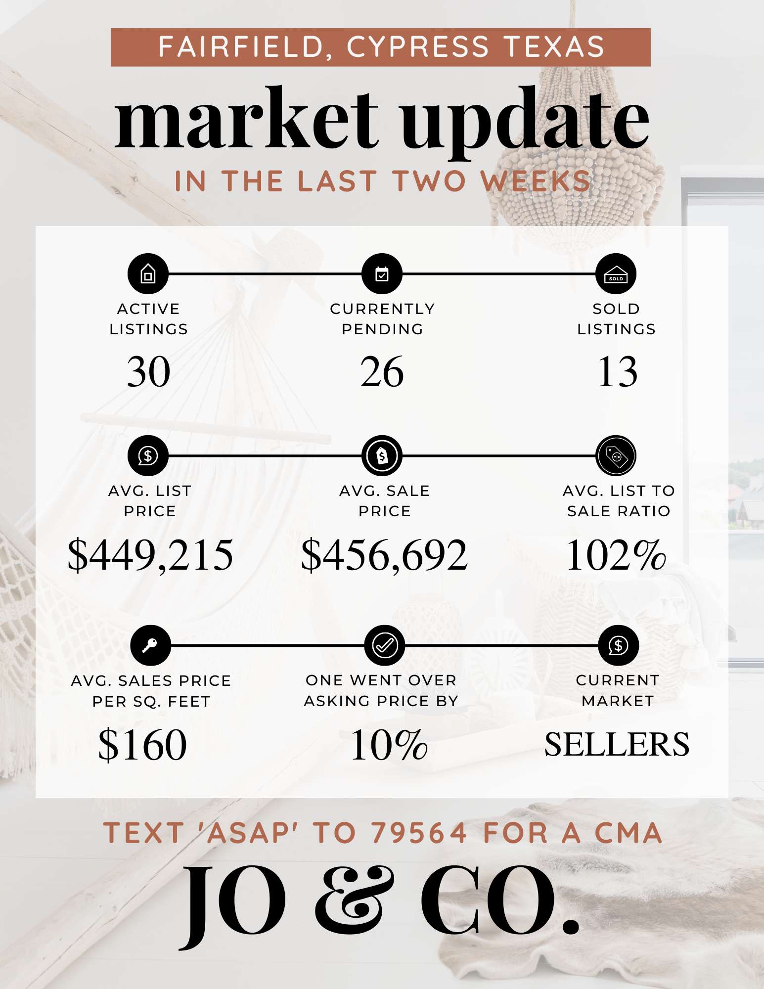 Hi neighbor, Today I will be sharing with you our perspective on the local real estate market here in Cypress, Texas, specifically a market update for the neighborhood of Fairfield. Whether you are looking to buy, sell, or just keep an eye on the market, we look forward to being your resource.