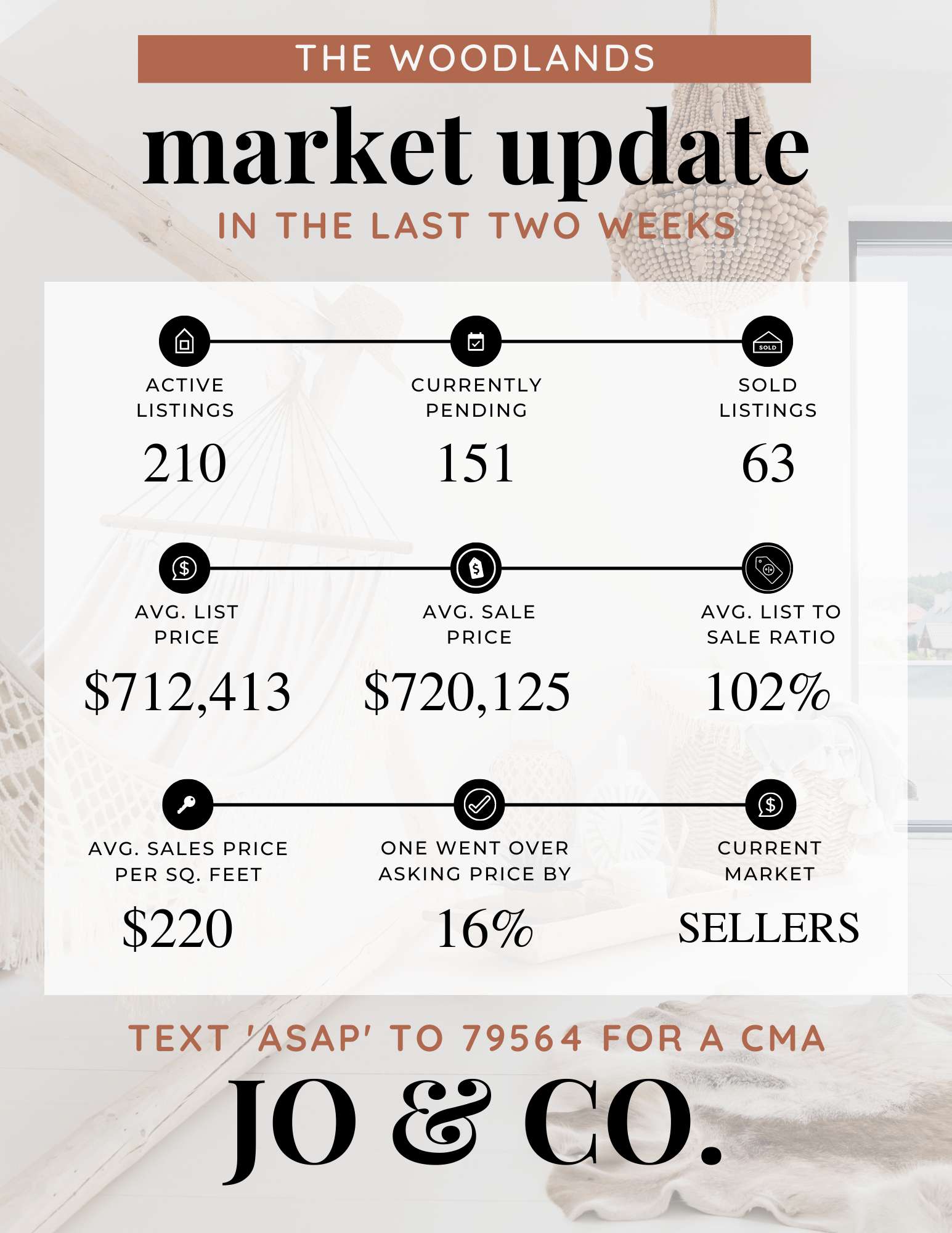 Check out the graphic below for a larger overview of the real estate market for the last two weeks in The Woodlands.