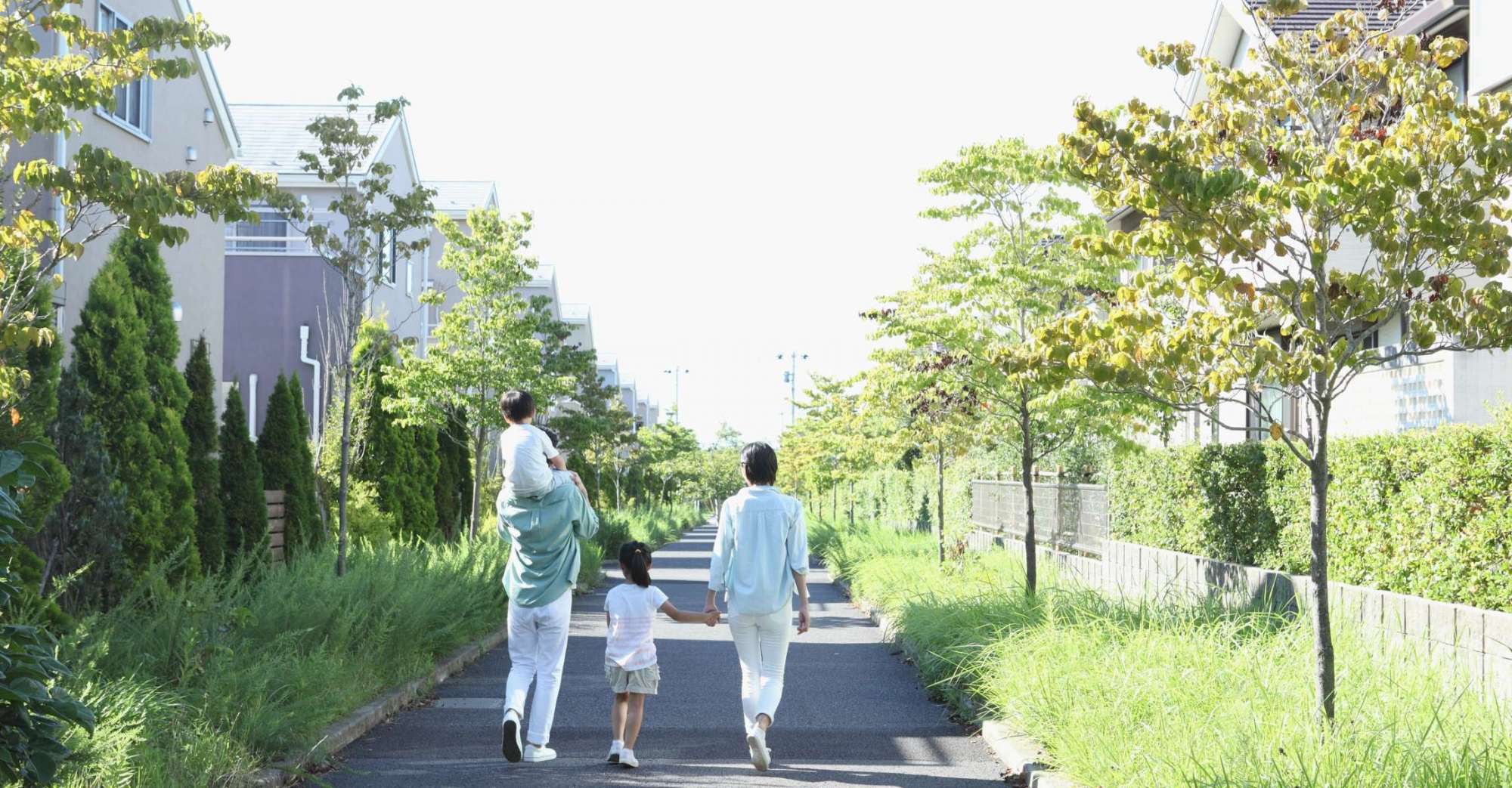 Evening walks under tall pines with the kids on bikes.